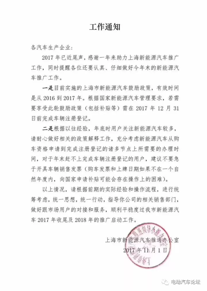 根据以往经验,年底时用户购买新能源汽车较多,充分考虑新能源汽车从购车资格申请到完成注册登记的诸多节点上所需要的办理时间,对于年末赶不上完成车辆注册登记的用户,建议不要急于开具车辆销售(购车和上牌日期如果不在一个自然年度内,向国家申请补贴可能会存在操作上的麻烦),个别有地补的城市从申请到顺利拿到牌照需要时间比较长,在18年政策未出台之前,部分经销商从11月份就进入办停业状态。为顺利过渡2017收尾和2018推广启动工作,有关部门以提前对车企下达通知。